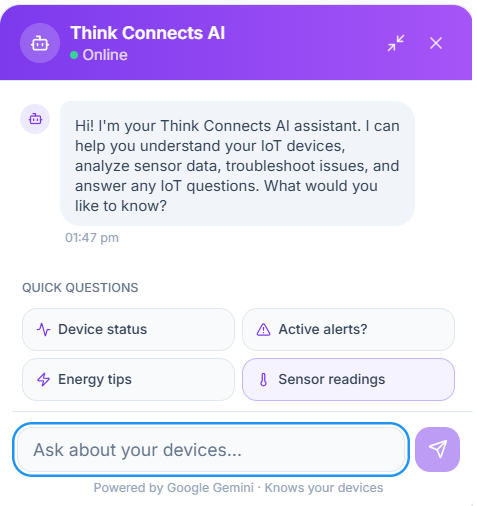 Think Connects supports a wide range of IoT devices and sensors such as temperature, humidity, air quality, GPS trackers, smart meters, machines, industrial assets, and more. Any device that can send data via standard protocols can be integrated.
